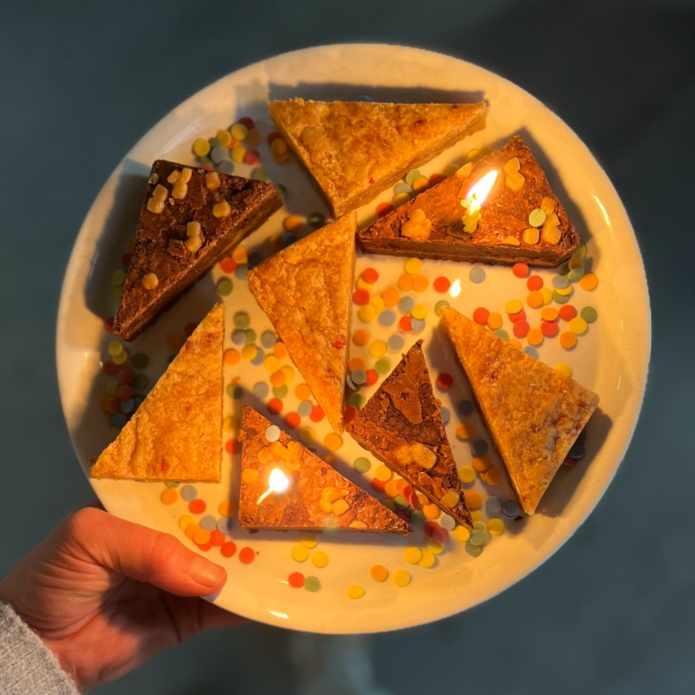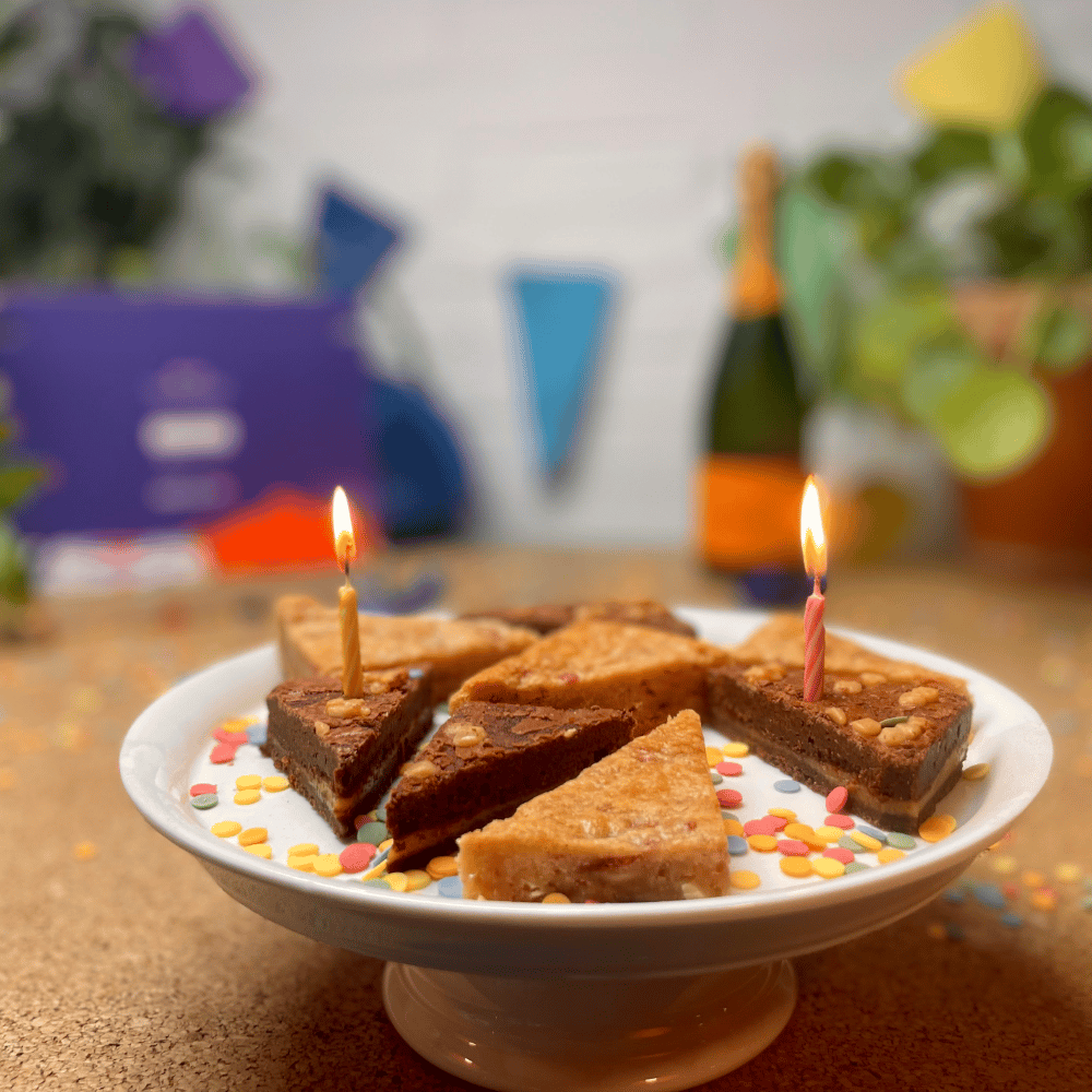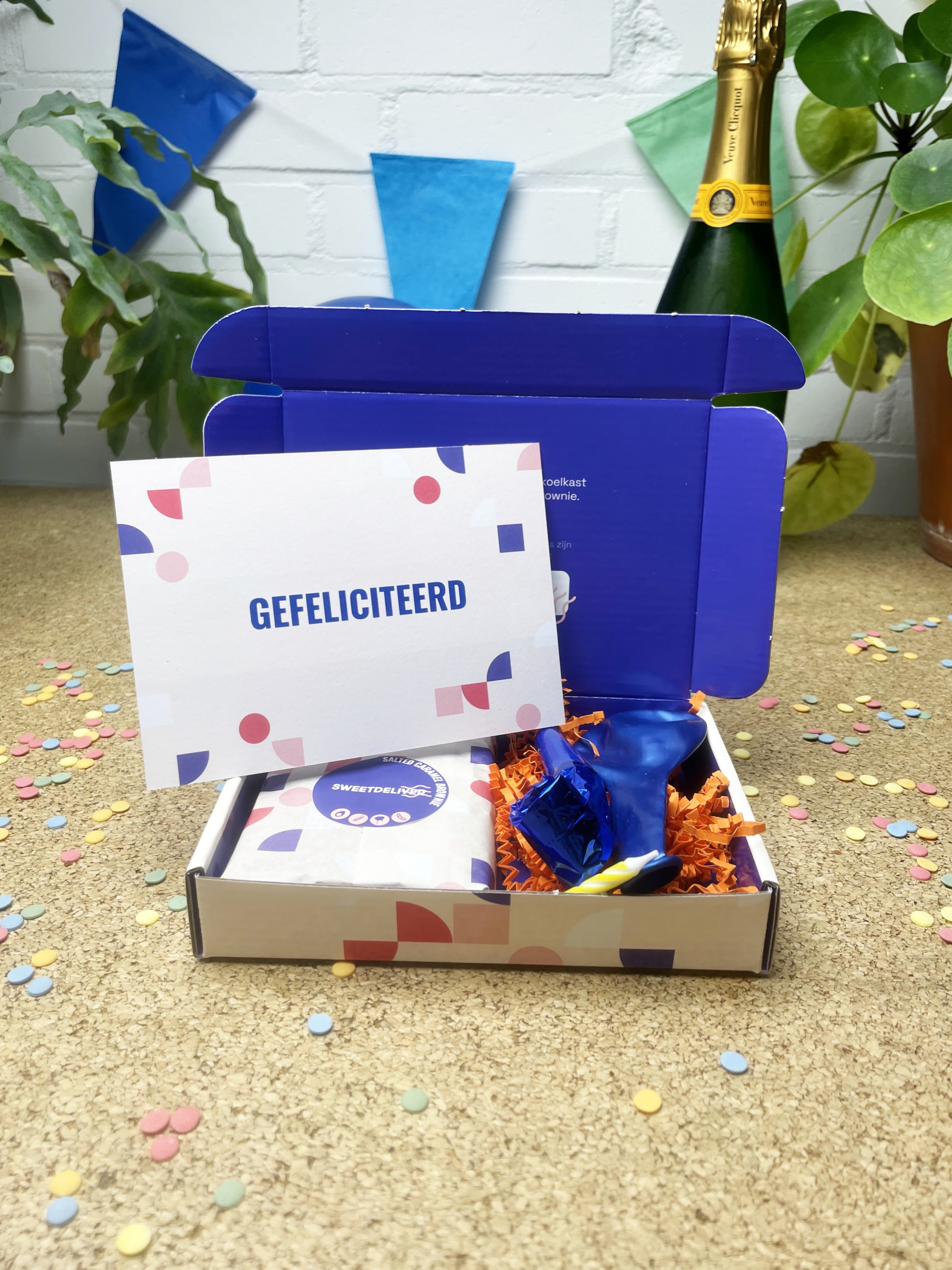 Wil jij jouw vegan vriend of collega verrassen met een leuk cadeau? Dan is deze vegan verjaardagsbox een perfect geschenk! Je kan zelf een heerlijke smaak kiezen voor 4 stukjes plantaardige brownie of blondie, no worries, ze smaken niet gezond en zijn gevaarlijk lekker! Voor de rest wordt de box feestelijk versierd met feesttoeter, balonnen en natuurlijk een verjaardagskaarsje! Laat het feestje maar beginnen!